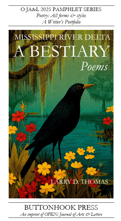 Title: Mississippi River Delta: A Bestiary Publisher: Button Hook Press (Pamphlet Series) Available for reading/printing as a PDF free of charge. https://ojalart.com/wp- |